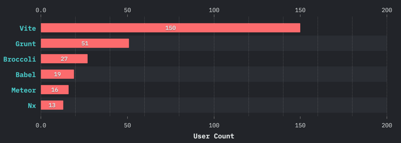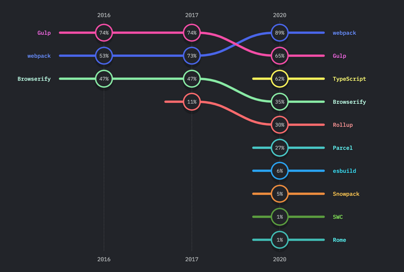 虽然短时间内 webpack 使用量还处于霸主地位,这一年打包工具的发生了巨大的变化。