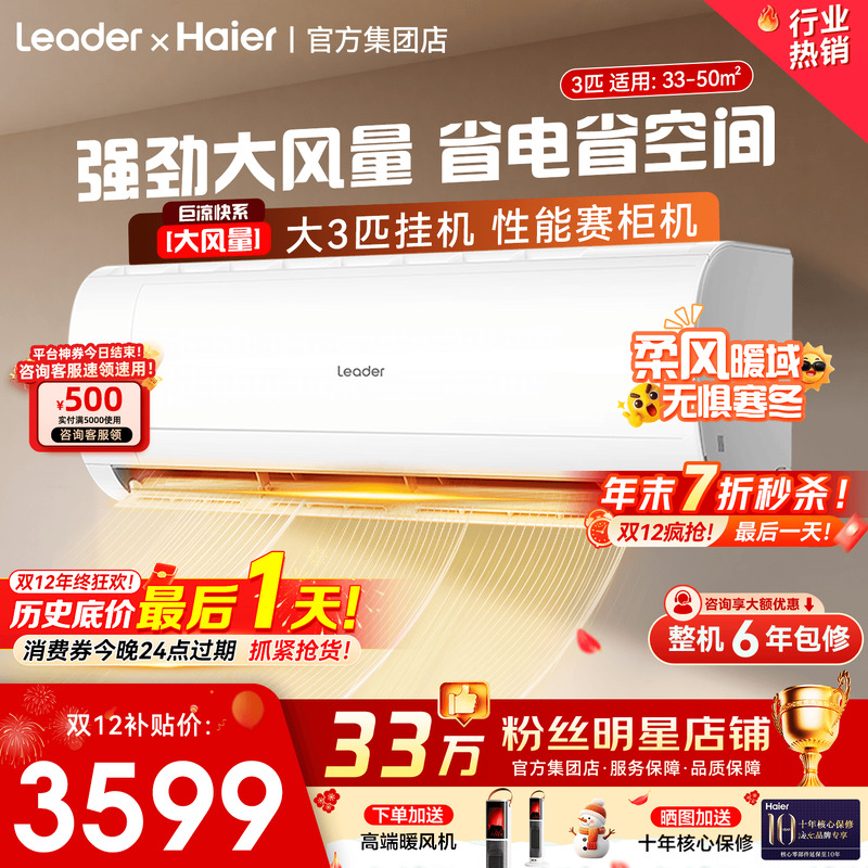 重磅新品]海尔统帅新风空调家用1.5匹一级变频卧室冷暖挂机旗舰店
