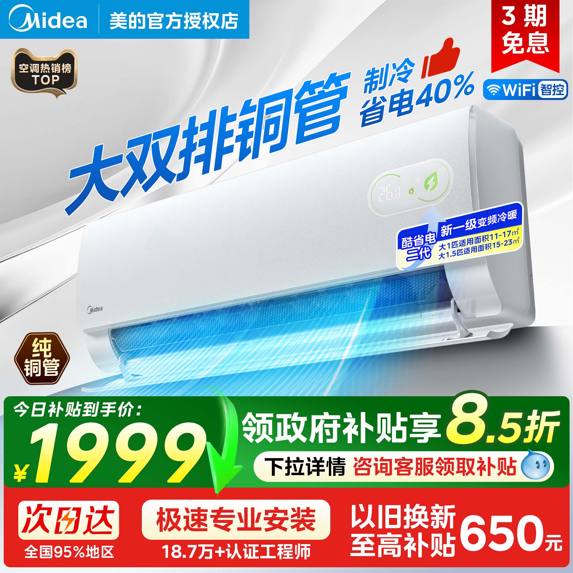 美的空调新品酷省电二代一级能效家用大1.5匹变频冷暖挂机正品