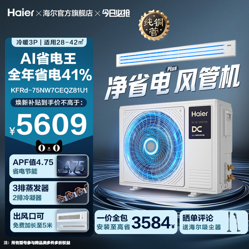 【省电王】海尔大3P净省电plus风管机超一级能效变频客厅中央空调