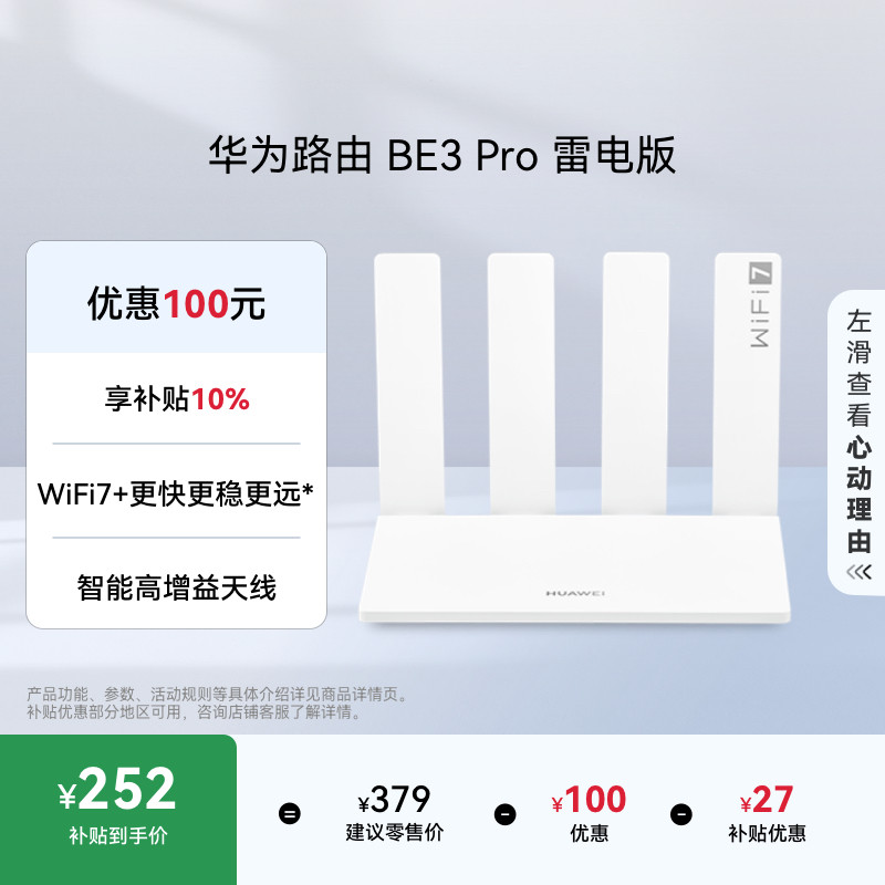 【新品】华为路由BE3 Pro 雷电版 Wi-Fi7+更快更远 智能高增益天线 家用高速千兆路由器游戏加速穿墙