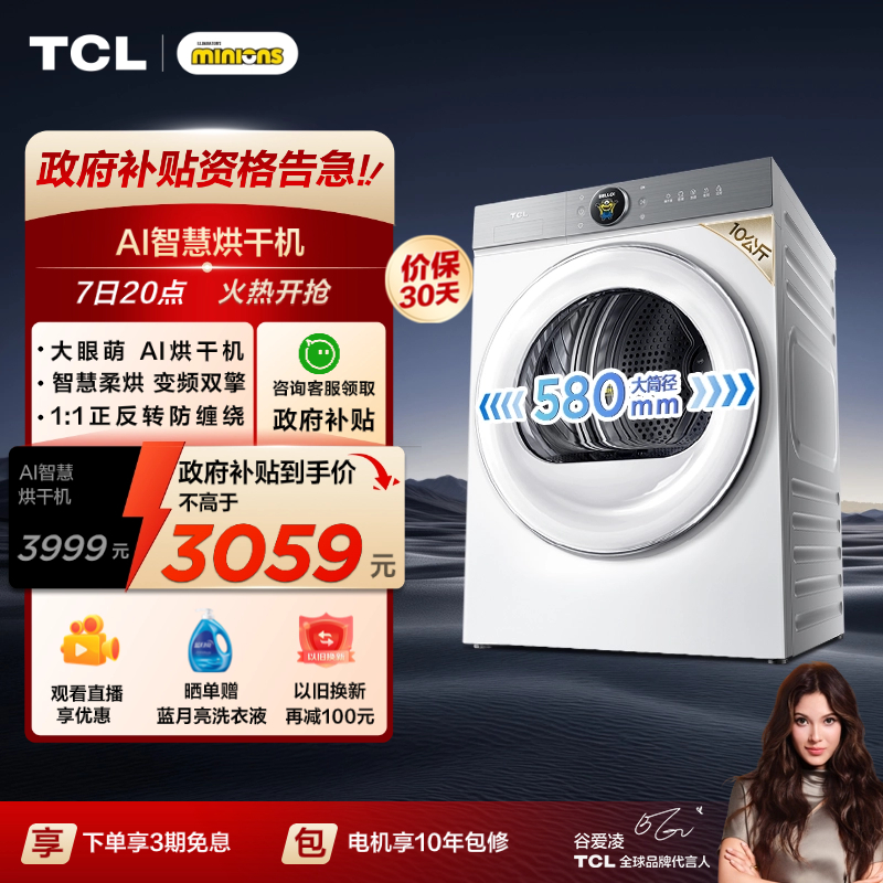 TCL大眼萌T7R10KG双擎热泵烘干机家用全自动家电国家补贴以旧换新