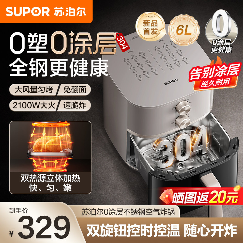 苏泊尔空气炸锅家用304不锈钢内胆0涂层2026新款双热源电炸锅烤箱