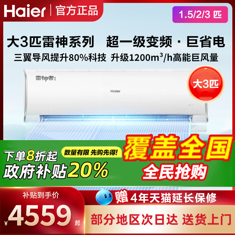 海尔家用3匹壁挂式空调一级能效挂机雷神2/1.5匹政府补贴家电入口