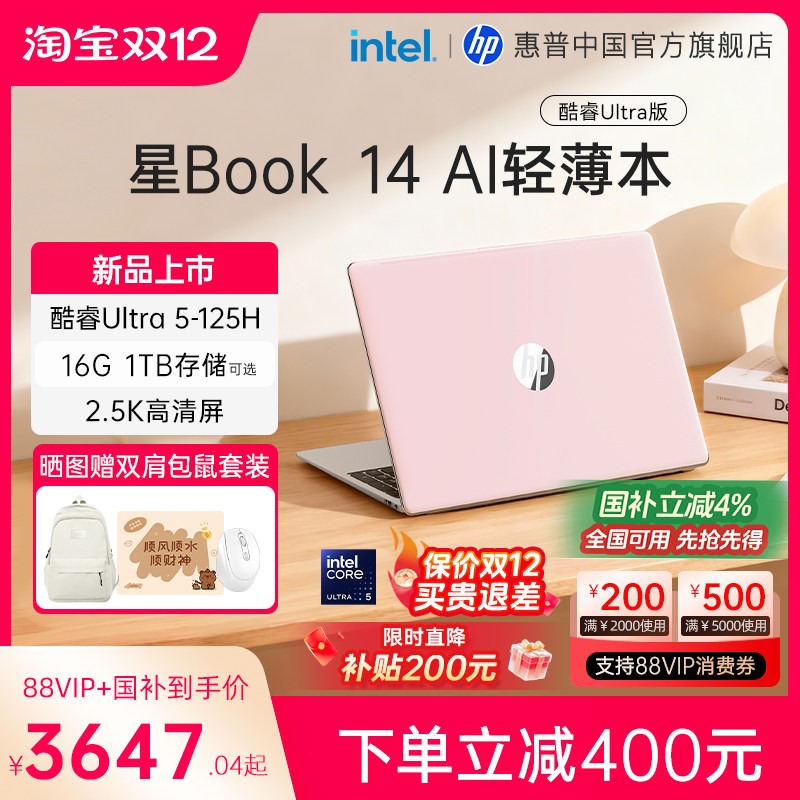 【百补加补+88VIP+4%国补】HP/惠普可选星Book14英特尔酷睿ultra5/7笔记本电脑轻薄便携学生AI办公官方旗舰店