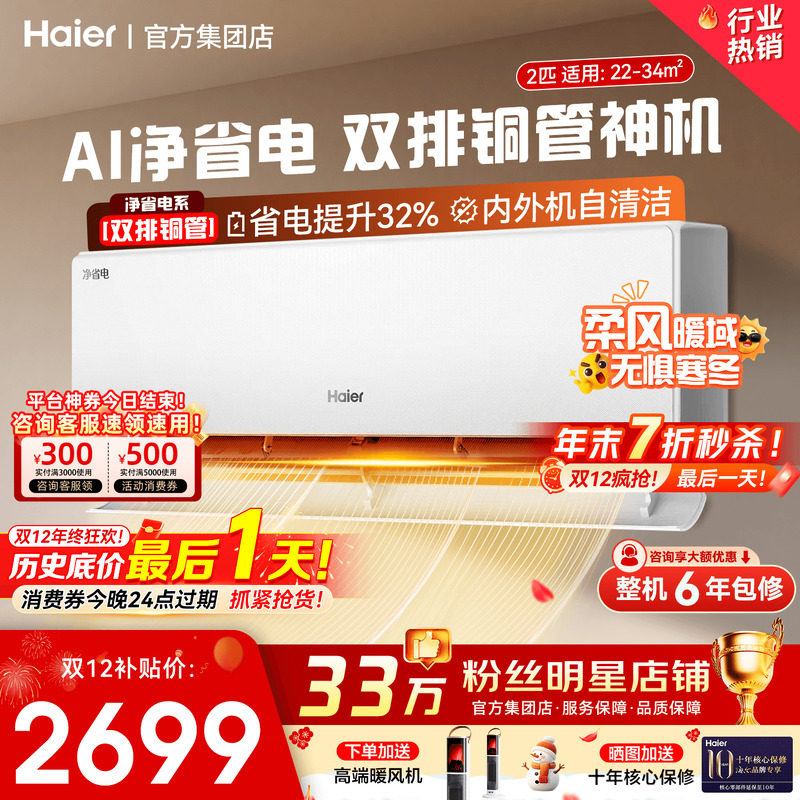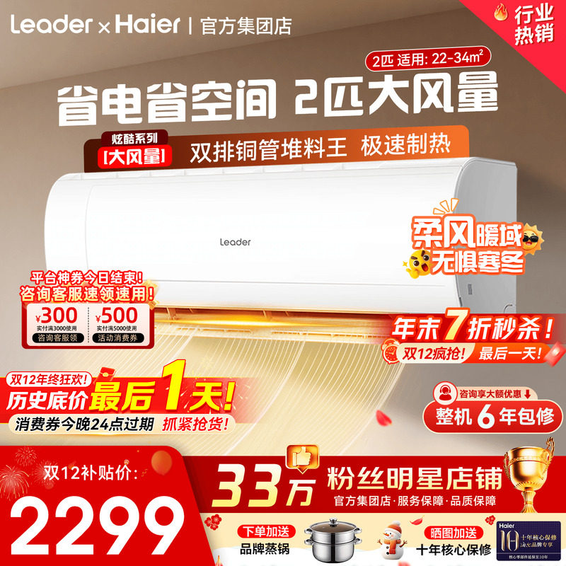 [国补20%】海尔空调大挂机2匹3匹家用客厅卧室一级变频冷暖旗舰店