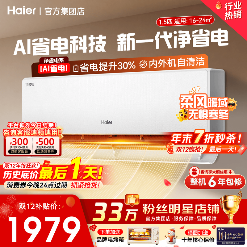 海尔家用空调1.5匹一级能效挂机1/2/3匹挂式变频出租屋用家电补贴