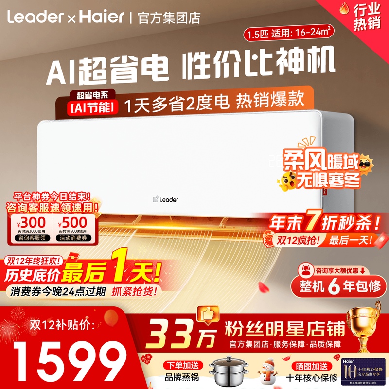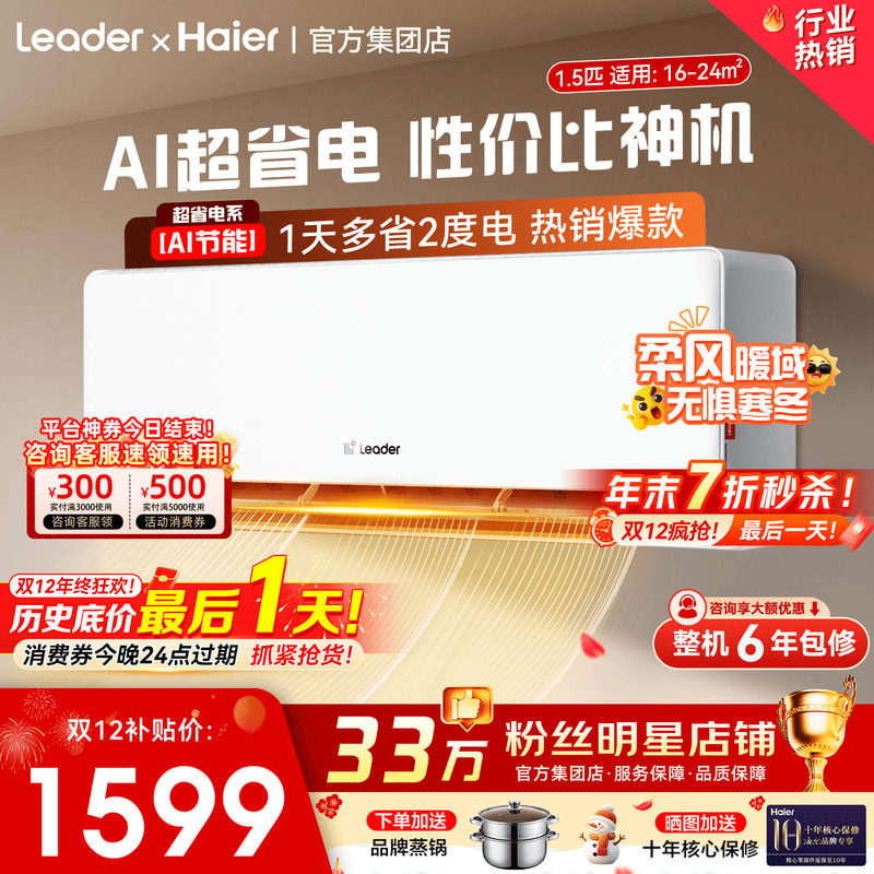 海尔空调1匹1.5匹2匹家用一级变频统帅卧室挂机冷暖省电LA1旗舰店
