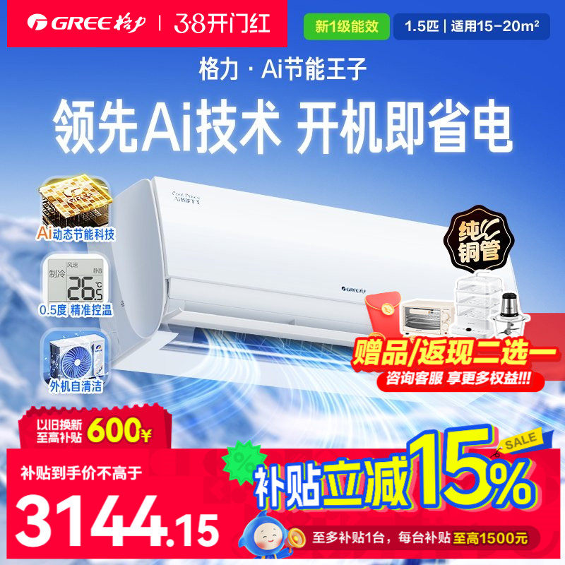 限时补贴】格力空调家用变频冷暖1.5匹一级挂机节能王子