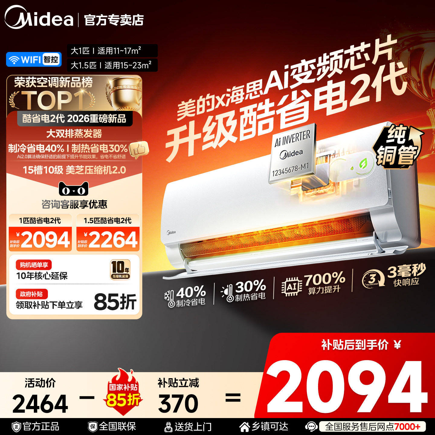 美的空调2026款酷省电二代大1匹大1.5匹一级能效家用变频冷暖挂机