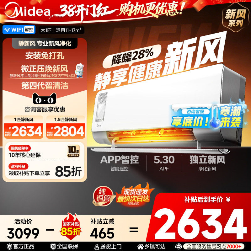 【纯铜管】美的空调1.5匹大1匹一级能效变频挂机冷暖除湿静新风
