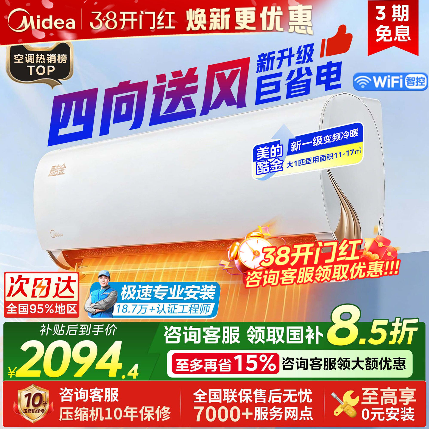 美的酷金2代空调大1匹一级变频冷暖家用节能省电挂机官方正品ZHA