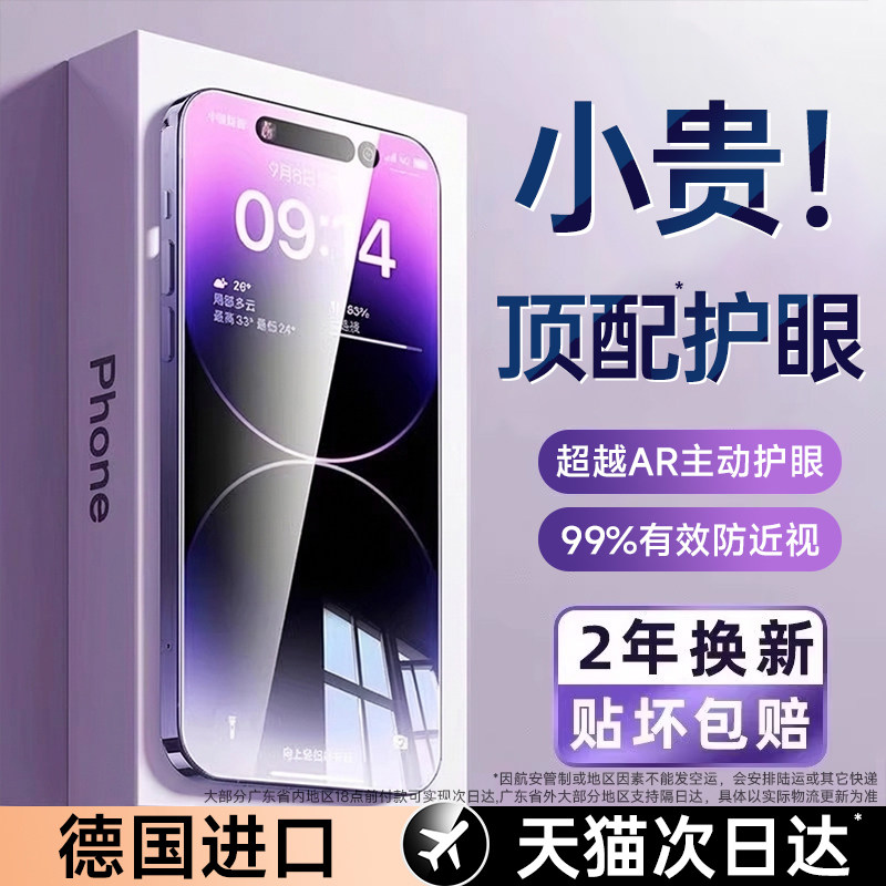 超AR德国顶配护眼】FIVI适用苹果17promax钢化膜iphone17pro手机膜16抗反射15防窥13贴膜plus康宁防蓝光保护