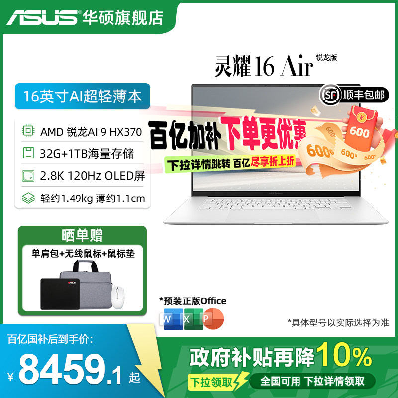 【全国补贴10%】华硕灵耀16 Air AMD锐龙 Al 9 HX370 2.8K 120Hz OLED16英寸颜值超轻薄商务笔记本电脑